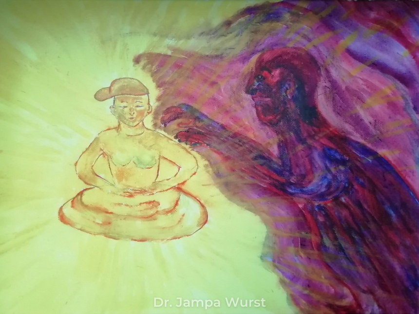 Remembering these chats with the Tibetan Buddhist nuns, who impressed me very much, and some became teachers for me, I played around with the idea of once becoming enlightened, making fun of myself during my painting, and didn´t take it too earnest. But the idea, that it is possible for every sentient being to become a Buddha, also an ant or my dog, so why not. You know, that Buddha Maitreya once first appeared in the form of a poor puppy, and then revealed themself as Buddha Maitreya 🙂 5s. for example http://aumamen.com/story/maitreya-appears-to-asanga and others.