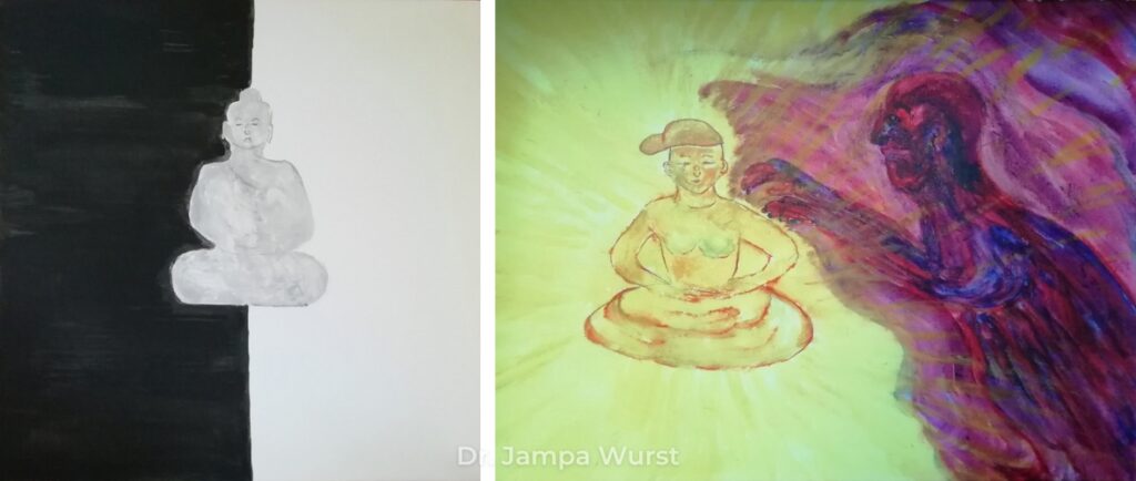 Both pictures are made with watercolor on canvas, and this first, is called „Feeding your Demons“. It is 40 to 30 centimeters in size, the second „Buddha“, is 40 to 40 in size. And I painted them two years ago in 2020, during the pandemic.